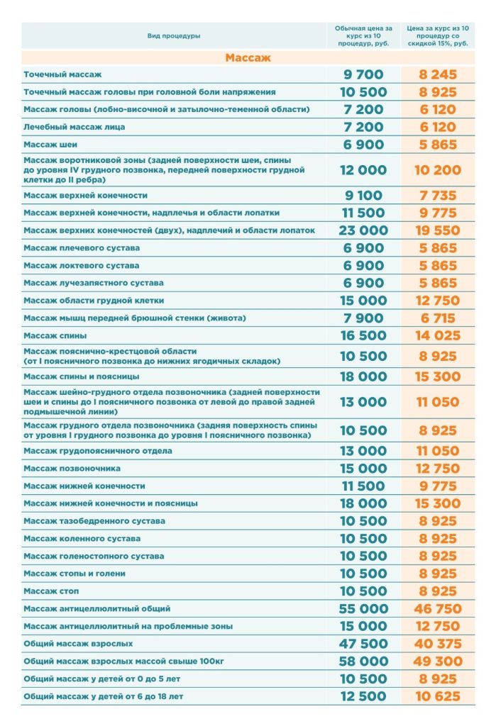 - Скидка действует только при единовременной оплате курса из 10 сеансов массажа одного вида для одного пациента. Список услуг, участвующих в акции, приведен выше в таблице.