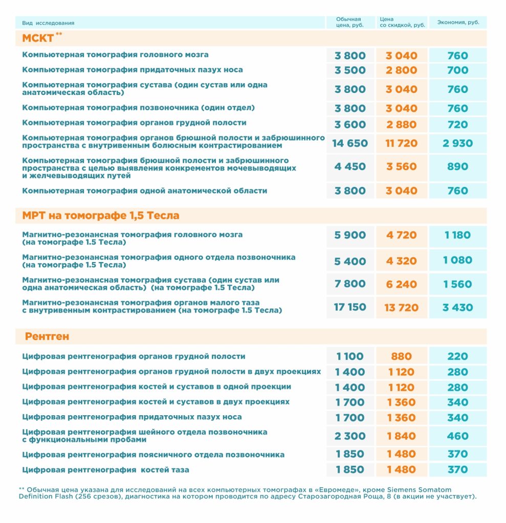 Также в рамках акции, действующей в период с 1 ноября 2025 г. по 28 февраля 2026 г., со скидкой 20%* можно пройти МРТ, МСКТ и рентген на оборудовании экспертного класса по другим адресам: