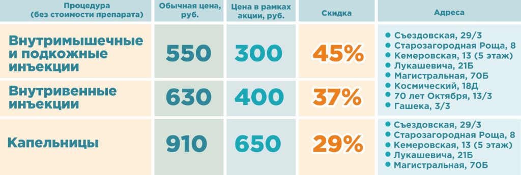А в рамках акции, проводимой с 15 декабря 2025 г. по 28 февраля 2026 г., можно сэкономить еще и на оплате процедур. По отдельным адресам «Евромеда» взрослые пациенты могут получить капельницы и инъекции со скидками до 45%*:
